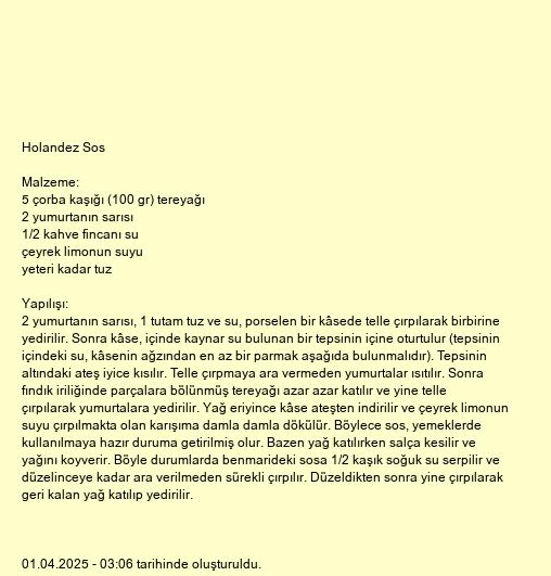 2 yumurtanın sarısı, 1 tutam tuz ve su, porselen bir kâsede telle çırpılarak birbirine yedirilir. Sonra kâse, içinde kaynar su bulunan bir tepsinin içine oturtulur (tepsinin içindeki su, kâsenin ağzından en az bir parmak aşağıda bulunmalıdır). Tepsinin altındaki ateş iyice kısılır. Telle çırpmaya ara vermeden yumurtalar ısıtılır. Sonra fındık iriliğinde parçalara bölünmüş tereyağı azar azar katılır ve yine telle çırpılarak yumurtalara yedirilir. Yağ eriyince kâse ateşten indirilir ve çeyrek limonun suyu çırpılmakta olan karışıma damla damla dökülür. Böylece sos, yemeklerde kullanılmaya hazır duruma getirilmiş olur. Bazen yağ katılırken salça kesilir ve yağını koyverir. Böyle durumlarda benmarideki sosa 1/2 kaşık soğuk su serpilir ve düzelinceye kadar ara verilmeden sürekli çırpılır. Düzeldikten sonra yine çırpılarak geri kalan yağ katılıp yedirilir.