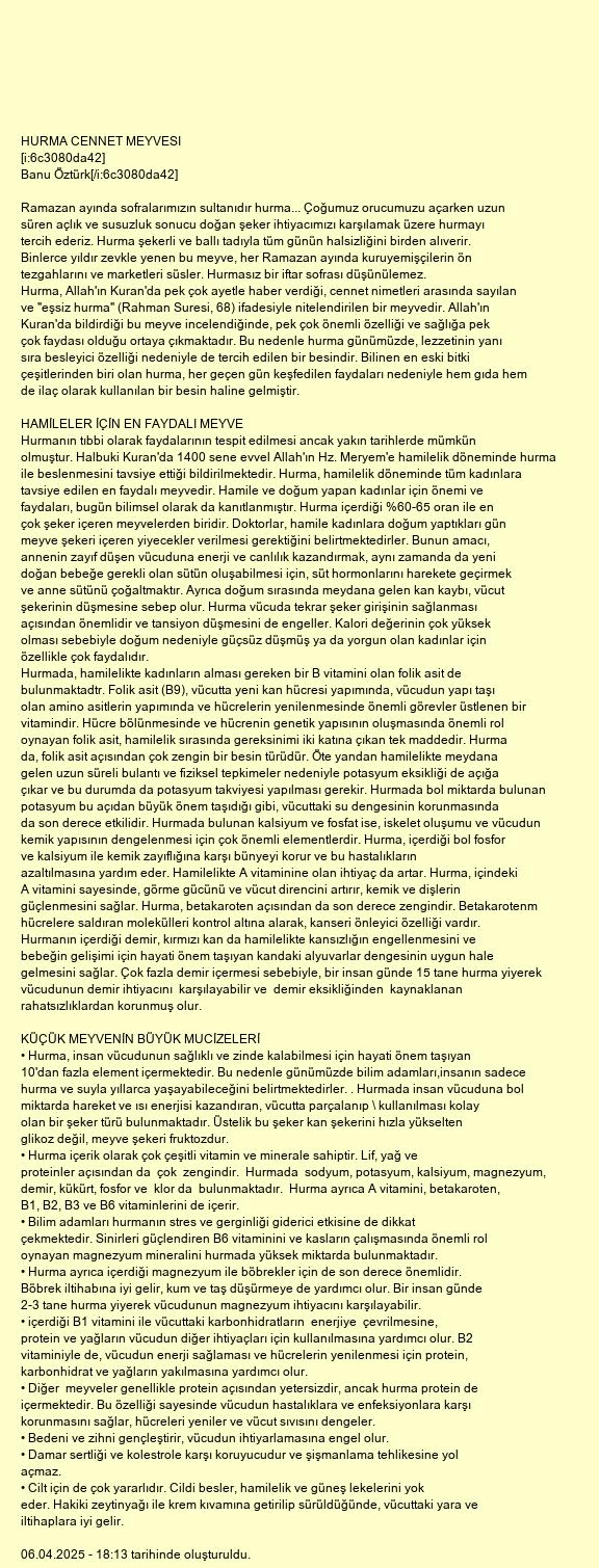Hurma, Allah'ın Kuran'da pek çok ayetle haber verdiği, cennet nimetleri arasında sayılan ve "eşsiz hurma" (Rahman Suresi, 68) ifadesiyle nitelendirilen bir meyvedir. Allah'ın Kuran'da bildirdiği bu meyve incelendiğinde, pek çok önemli özelliği ve sağlığa pek çok faydası olduğu ortaya çıkmaktadır. Bu nedenle hurma günümüzde, lezzetinin yanı sıra besleyici özelliği nedeniyle de tercih edilen bir besindir. Bilinen en eski bitki çeşitlerinden biri olan hurma, her geçen gün keşfedilen faydaları nedeniyle hem gıda hem de ilaç olarak kullanılan bir besin haline gelmiştir.