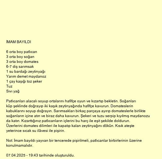 Not: İmam bayıldı yayvan bir tencerede pişirilmeli, patlıcanlar birbirlerinin üzerine konulmamalıdır.
