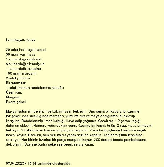 Mayayı sütün içinde eritin ve kabarmasını bekleyin. Unu geniş bir kaba alıp, üzerine toz şeker, oda sıcaklığında margarin, yumurta, tuz ve maya erittiğiniz sütü ekleyip karıştırın. Rendelenmiş limon kabuğu ilave edip yoğurun. Gerekirse 1-2 çorba kaşığı daha un ekleyin. Hamuru yoğurduktan sonra üzerine bir kapak örtüp, 2 saat mayalanmasını bekleyin. 2 kat kabaran hamurdan parçalar koparın. Yuvarlayıp, içlerine birer incir reçeli tanesi koyun. Hamuru, açık yeri kalmayacak şekilde kapatın. Yağlanmış fırın tepsisine sıralayın. Her birinin üzerine bir parça margarin koyun. 200 derece fırında pembeleşene dek pişirin. Üzerine pudra şekeri serperek servis yapın.