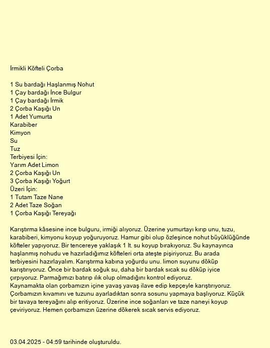 Karıştırma kâsesine ince bulguru, irmiği alıyoruz. Üzerine yumurtayı kırıp unu, tuzu, karabiberi, kimyonu koyup yoğuruyoruz. Hamur gibi olup özleşince nohut büyüklüğünde köfteler yapıyoruz. Bir tencereye yaklaşık 1 It. su koyup bırakıyoruz. Su kaynayınca haşlanmış nohudu ve hazırladığımız köfteleri orta ateşte pişiriyoruz. Bu arada terbiyesini hazırlayalım. Karıştırma kabına yoğurdu unu. limon suyunu döküp karıştırıyoruz. Önce bir bardak soğuk su, daha bir bardak sıcak su döküp iyice çırpıyoruz. Parmağımızı batırıp ılık olup olmadığını kontrol ediyoruz. Kaynamakta olan çorbamızın içine yavaş yavaş ilave edip kepçeyle karıştırıyoruz. Çorbamızın kıvamını ve tuzunu ayarladıktan sonra sosunu yapmaya başlıyoruz. Küçük bir tavaya tereyağını alıp eritiyoruz. Üzerine ince soğanları ve taze naneyi koyup çeviriyoruz. Hemen çorbamızın üzerine dökerek sıcak servis ediyoruz.