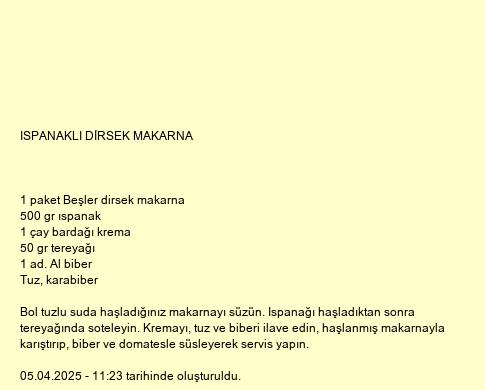 Bol tuzlu suda haşladığınız makarnayı süzün. Ispanağı haşladıktan sonra tereyağında soteleyin. Kremayı, tuz ve biberi ilave edin, haşlanmış makarnayla karıştırıp, biber ve domatesle süsleyerek servis yapın.