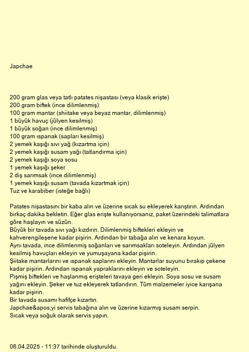 Japchae'yi servis tabağına alın ve üzerine kızarmış susam serpin.