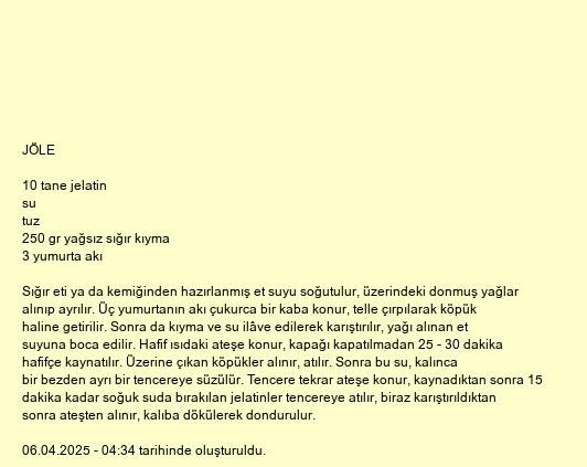 Sığır eti ya da kemiğinden hazırlanmış et suyu soğutulur, üzerindeki donmuş yağlar alınıp ayrılır. Üç yumurtanın akı çukurca bir kaba konur, telle çırpılarak köpük haline getirilir. Sonra da kıyma ve su ilâve edilerek karıştırılır, yağı alınan et suyuna boca edilir. Hafif ısıdaki ateşe konur, kapağı kapatılmadan 25 - 30 dakika hafifçe kaynatılır. Üzerine çıkan köpükler alınır, atılır. Sonra bu su, kalınca bir bezden ayrı bir tencereye süzülür. Tencere tekrar ateşe konur, kaynadıktan sonra 15 dakika kadar soğuk suda bırakılan jelatinler tencereye atılır, biraz karıştırıldıktan sonra ateşten alınır, kalıba dökülerek dondurulur.