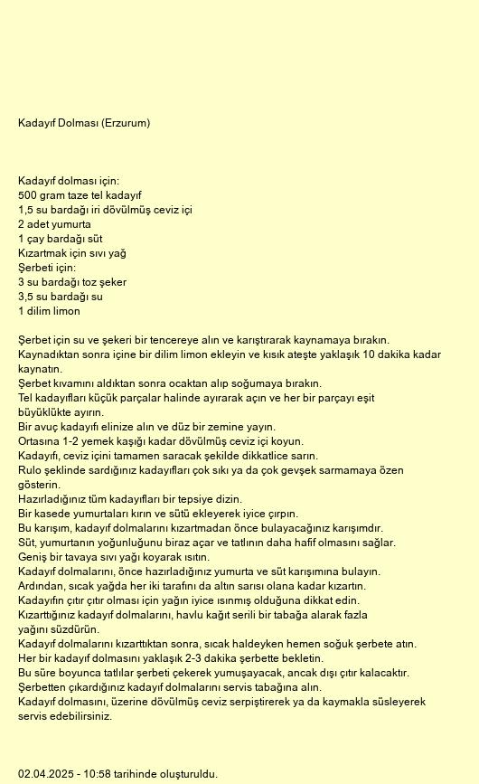 Kadayıf dolmasını, üzerine dövülmüş ceviz serpiştirerek ya da kaymakla süsleyerek servis edebilirsiniz.