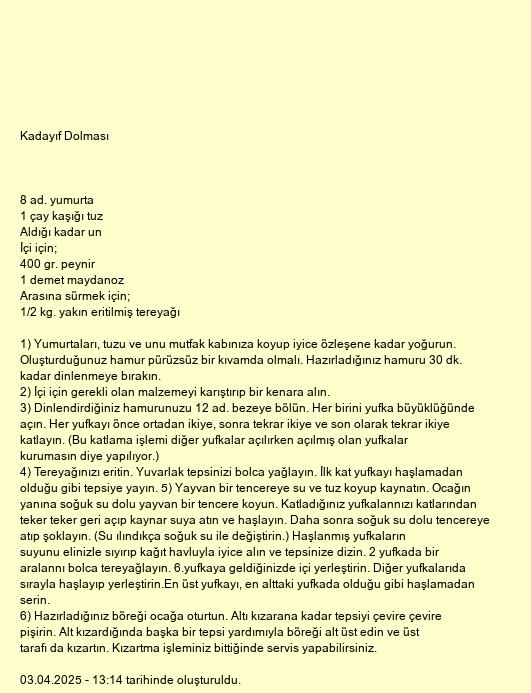 4) Tereyağınızı eritin. Yuvarlak tepsinizi bolca yağlayın. İlk kat yufkayı haşlamadan olduğu gibi tepsiye yayın. 5) Yayvan bir tencereye su ve tuz koyup kaynatın. Ocağın yanına soğuk su dolu yayvan bir tencere koyun. Katladığınız yufkalannızı katlarından teker teker geri açıp kaynar suya atın ve haşlayın. Daha sonra soğuk su dolu tencereye atıp şoklayın. (Su ılındıkça soğuk su ile değiştirin.) Haşlanmış yufkaların suyunu elinizle sıyırıp kağıt havluyla iyice alın ve tepsinize dizin. 2 yufkada bir aralannı bolca tereyağlayın. 6.yufkaya geldiğinizde içi yerleştirin. Diğer yufkalarıda sırayla haşlayıp yerleştirin.En üst yufkayı, en alttaki yufkada olduğu gibi haşlamadan serin.