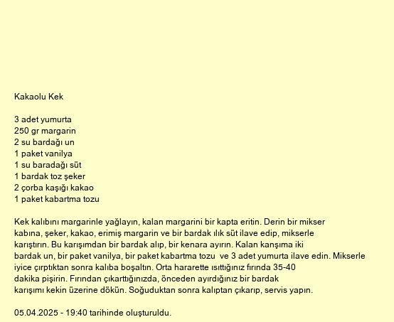 Kek kalıbını margarinle yağlayın, kalan margarini bir kapta eritin. Derin bir mikser kabına, şeker, kakao, erimiş margarin ve bir bardak ılık süt ilave edip, mikserle karıştırın. Bu karışımdan bir bardak alıp, bir kenara ayırın. Kalan kanşıma iki bardak un, bir paket vanilya, bir paket kabartma tozu ve 3 adet yumurta ilave edin. Mikserle iyice çırptıktan sonra kalıba boşaltın. Orta hararette ısıttığınız fırında 35-40 dakika pişirin. Fırından çıkarttığınızda, önceden ayırdığınız bir bardak karışımı kekin üzerine dökün. Soğuduktan sonra kalıptan çıkarıp, servis yapın.