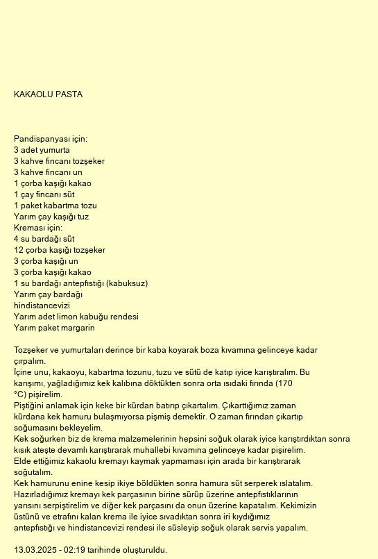 İçine unu, kakaoyu, kabartma tozunu, tuzu ve sütü de katıp iyice karıştıralım. Bu karışımı, yağladığımız kek kalıbına döktükten sonra orta ısıdaki fırında (170 °C) pişirelim.