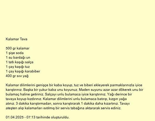 Kalamar dilimlerini genişçe bir kaba koyup, tuz ve biberi ekleyerek parmaklarınızla iyice karıştırınız. Başka bir çukur kaba unu koyunuz. Maden suyunu azar azar dökerek unu bir bulamaç haline getiriniz. Salçayı unlu bulamaca iyice karıştırınız. Yağı derince bir tavaya koyup kızdırınız. Kalamar dilimlerini unlu bulamaca batırıp, kızgın yağa atınız. 3 dakika karıştırmadan, sonra karıştırarak 1 dakika daha kızartınız. Tavayı ateşten alıp kalamarları ısıtılmış bir servis tabağına aktararak servis ediniz.