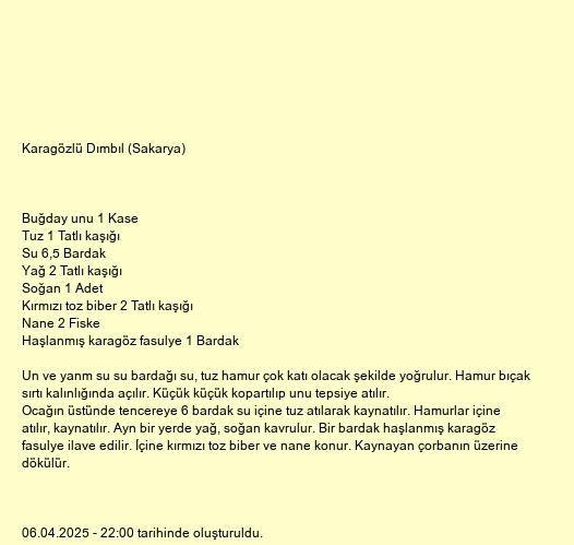 Un ve yanm su su bardağı su, tuz hamur çok katı olacak şekilde yoğrulur. Hamur bıçak sırtı kalınlığında açılır. Küçük küçük kopartılıp unu tepsiye atılır. Ocağın üstünde tencereye 6 bardak su içine tuz atılarak kaynatılır. Hamurlar içine atılır, kaynatılır. Ayn bir yerde yağ, soğan kavrulur. Bir bardak haşlanmış karagöz fasulye ilave edilir. İçine kırmızı toz biber ve nane konur. Kaynayan çorbanın üzerine dökülür.