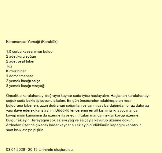Öncelikle karalahanayı doğrayıp kaynar suda iyice haşlayalım. Haşlanan karalahanayı soğuk suda bekletip suyunu sıkalım. Bir gün öncesinden ıslatılmış olan mısır bulguruna biberleri, uzun doğranan soğanları ve yarım çay bardağından biraz daha az yağı ilave ederek karıştıralım. Düdüklü tencerenin en alt kısmına iki avuç mancar koyup mısır karışımını da üzerine ilave edin. Kalan mancarı tekrar koyup üzerine bulgur ekleyin. Tereyağını çok az sıvı yağ ve salçayla kavurup üzerine dökün. Ardından üzerine çıkacak kadar kaynar su ekleyip düdüklünün kapağını kapatın. 1 saat kısık ateşte pişirin.