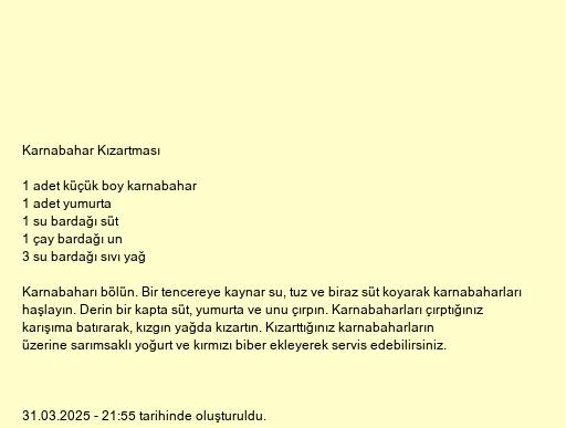 Karnabaharı bölün. Bir tencereye kaynar su, tuz ve biraz süt koyarak karnabaharları haşlayın. Derin bir kapta süt, yumurta ve unu çırpın. Karnabaharları çırptığınız karışıma batırarak, kızgın yağda kızartın. Kızarttığınız karnabaharların üzerine sarımsaklı yoğurt ve kırmızı biber ekleyerek servis edebilirsiniz.
