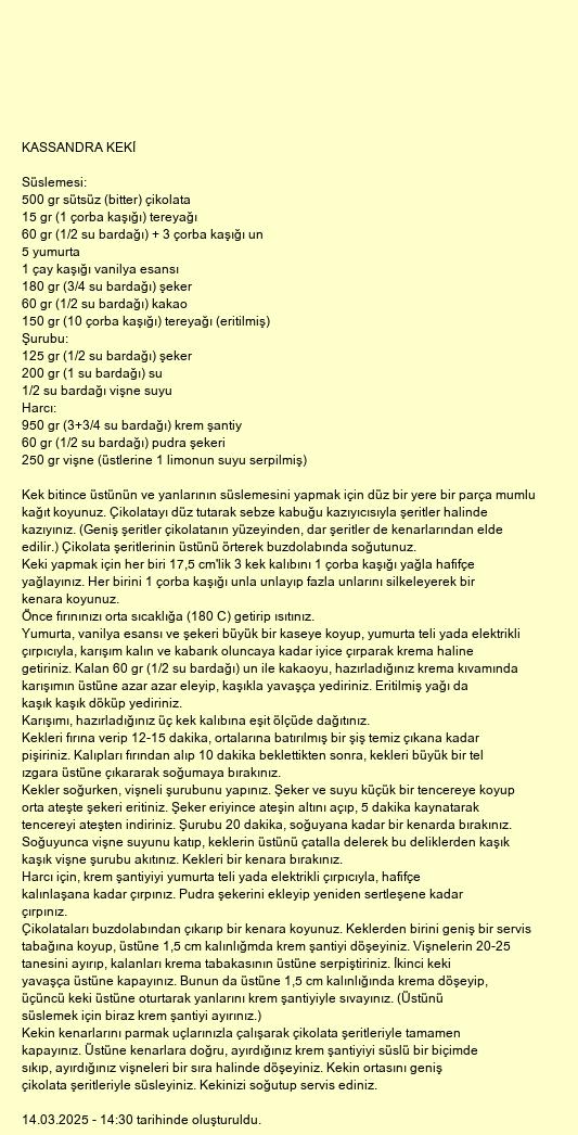 Çikolataları buzdolabından çıkarıp bir kenara koyunuz. Keklerden birini geniş bir servis tabağına koyup, üstüne 1,5 cm kalınlığmda krem şantiyi döşeyiniz. Vişnelerin 20-25 tanesini ayırıp, kalanları krema tabakasının üstüne serpiştiriniz. İkinci keki yavaşça üstüne kapayınız. Bunun da üstüne 1,5 cm kalınlığında krema döşeyip, üçüncü keki üstüne oturtarak yanlarını krem şantiyiyle sıvayınız. (Üstünü süslemek için biraz krem şantiyi ayırınız.)