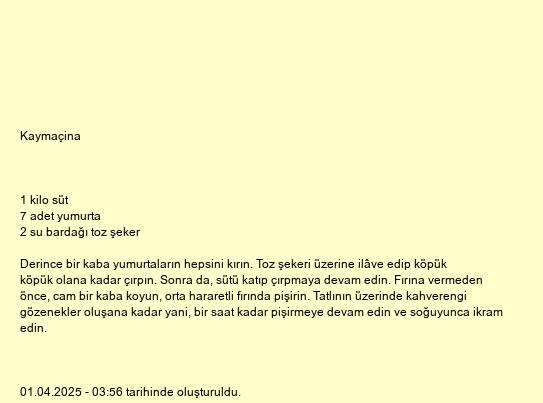 Derince bir kaba yumurtaların hepsini kırın. Toz şekeri üzerine ilâve edip köpük köpük olana kadar çırpın. Sonra da, sütü katıp çırpmaya devam edin. Fırına vermeden önce, cam bir kaba koyun, orta hararetli fırında pişirin. Tatlının üzerinde kahverengi gözenekler oluşana kadar yani, bir saat kadar pişirmeye devam edin ve soğuyunca ikram edin.