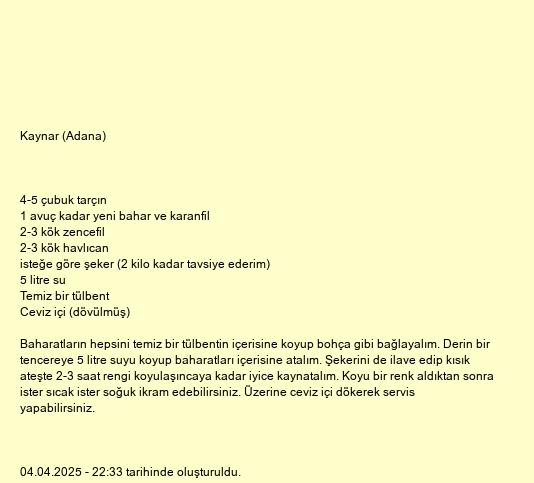 Baharatların hepsini temiz bir tülbentin içerisine koyup bohça gibi bağlayalım. Derin bir tencereye 5 litre suyu koyup baharatları içerisine atalım. Şekerini de ilave edip kısık ateşte 2-3 saat rengi koyulaşıncaya kadar iyice kaynatalım. Koyu bir renk aldıktan sonra ister sıcak ister soğuk ikram edebilirsiniz. Üzerine ceviz içi dökerek servis yapabilirsiniz.