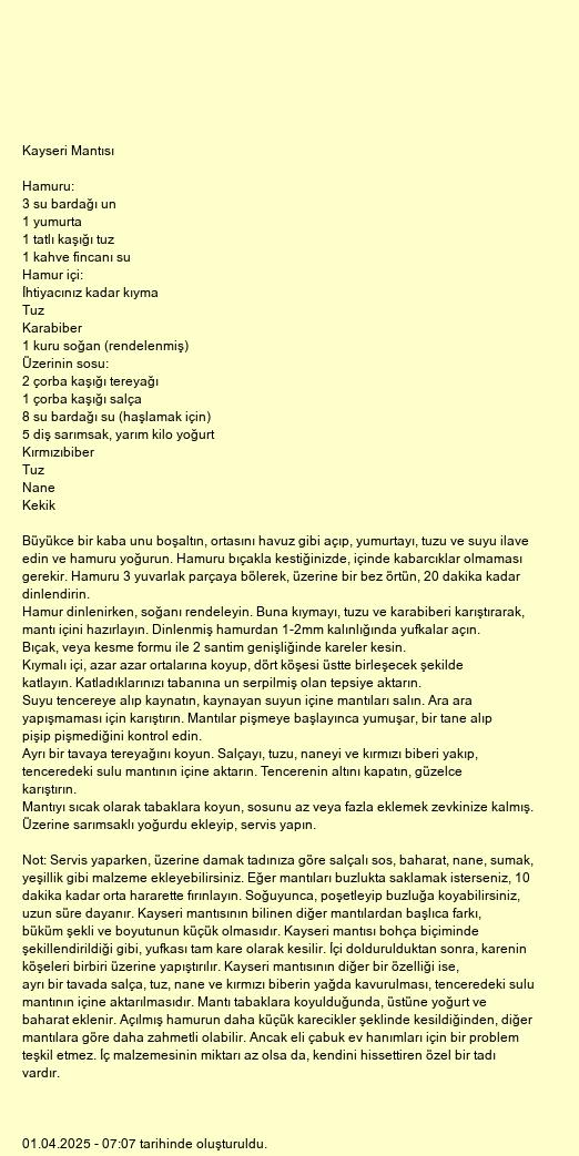 Not: Servis yaparken, üzerine damak tadınıza göre salçalı sos, baharat, nane, sumak, yeşillik gibi malzeme ekleyebilirsiniz. Eğer mantıları buzlukta saklamak isterseniz, 10 dakika kadar orta hararette fırınlayın. Soğuyunca, poşetleyip buzluğa koyabilirsiniz, uzun süre dayanır. Kayseri mantısının bilinen diğer mantılardan başlıca farkı, büküm şekli ve boyutunun küçük olmasıdır. Kayseri mantısı bohça biçiminde şekillendirildiği gibi, yufkası tam kare olarak kesilir. İçi doldurulduktan sonra, karenin köşeleri birbiri üzerine yapıştırılır. Kayseri mantısının diğer bir özelliği ise, ayrı bir tavada salça, tuz, nane ve kırmızı biberin yağda kavurulması, tenceredeki sulu mantının içine aktarılmasıdır. Mantı tabaklara koyulduğunda, üstüne yoğurt ve baharat eklenir. Açılmış hamurun daha küçük karecikler şeklinde kesildiğinden, diğer mantılara göre daha zahmetli olabilir. Ancak eli çabuk ev hanımları için bir problem teşkil etmez. İç malzemesinin miktarı az olsa da, kendini hissettiren özel bir tadı vardır.