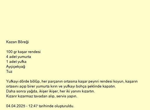 Yufkayı dörde bölüp, her parçanın ortasına kaşar peynri rendesi koyun, kaşarın ortasını açıp birer yumurta kırın ve yufkayı bohça şeklinde kapatın.
