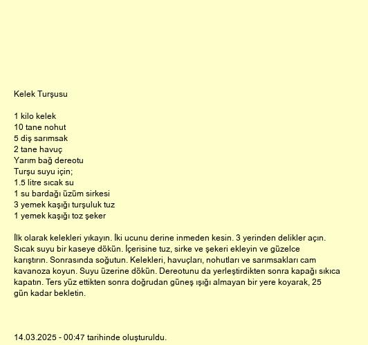 İlk olarak kelekleri yıkayın. İki ucunu derine inmeden kesin. 3 yerinden delikler açın. Sıcak suyu bir kaseye dökün. İçerisine tuz, sirke ve şekeri ekleyin ve güzelce karıştırın. Sonrasında soğutun. Kelekleri, havuçları, nohutları ve sarımsakları cam kavanoza koyun. Suyu üzerine dökün. Dereotunu da yerleştirdikten sonra kapağı sıkıca kapatın. Ters yüz ettikten sonra doğrudan güneş ışığı almayan bir yere koyarak, 25 gün kadar bekletin.