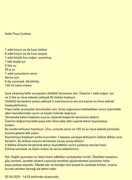 Not: Sağlık açısından en fazla önem atfedilen çorbalardan biridir. Özellikle hastalara güç vermesi, içindeki jelatinli yapısıyla kemikleri güçlendirmesi açısından kelle paça çorbası eşsizdir. Elbette etin ve kemiğin tüm lezzeti bu çorbada birleşir, insana kuvvet verirken damağı da tatmin eder.