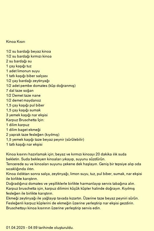 Kinoa ılıdıktan sonra salça, zeytinyağı, limon suyu, tuz, pul biber, sumak, nar ekşisi ile birlikte karıştırın.