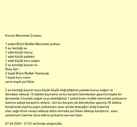 2 su bardağı kaynar suya küçük küçük doğradığımız patates,havuç soğan ve domatesi ekleyip 15 dakika kaynatırız ve bu karışımı blenderdan geçiririz.başka bir tencerede 5 bardak soğuk suya eklediğimiz 1 paket bizim mutfak mercimek çorbasının üzerine sebze karışımını ekleriz...tüm bu karışımı da blenderdan geçirirp 30 dakika karıştırarak pişiririz.pişen çorbamızın sosu içinde tereyağını eritip kızarmış olan yağa önce naneyi ekleyip daha sonrada pul biberi ekleyip karıştırırız...sosu çorbamızın üzerine ilave ederiz.çorbamız servise hazır.