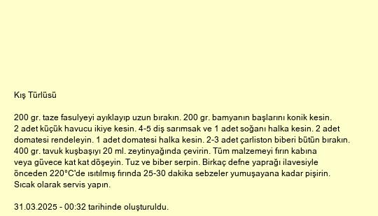 200 gr. taze fasulyeyi ayıklayıp uzun bırakın. 200 gr. bamyanın başlarını konik kesin. 2 adet küçük havucu ikiye kesin. 4-5 diş sarımsak ve 1 adet soğanı halka kesin. 2 adet domatesi rendeleyin. 1 adet domatesi halka kesin. 2-3 adet çarliston biberi bütün bırakın. 400 gr. tavuk kuşbaşıyı 20 ml. zeytinyağında çevirin. Tüm malzemeyi fırın kabına veya güvece kat kat döşeyin. Tuz ve biber serpin. Birkaç defne yaprağı ilavesiyle önceden 220°C'de ısıtılmış fırında 25-30 dakika sebzeler yumuşayana kadar pişirin. Sıcak olarak servis yapın.