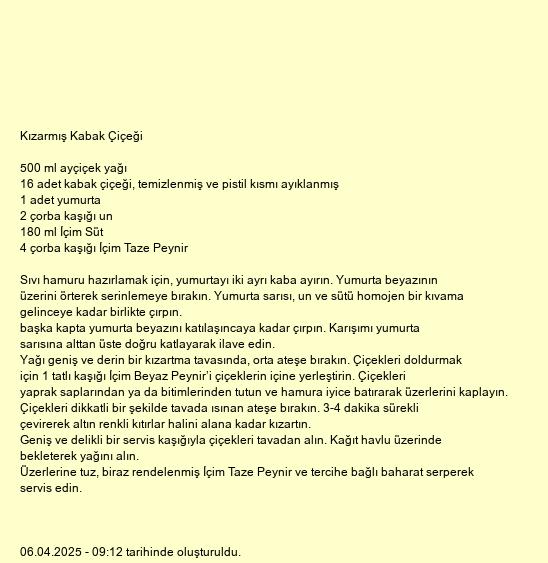 Yağı geniş ve derin bir kızartma tavasında, orta ateşe bırakın. Çiçekleri doldurmak için 1 tatlı kaşığı İçim Beyaz Peynir’i çiçeklerin içine yerleştirin. Çiçekleri yaprak saplarından ya da bitimlerinden tutun ve hamura iyice batırarak üzerlerini kaplayın. Çiçekleri dikkatli bir şekilde tavada ısınan ateşe bırakın. 3-4 dakika sürekli çevirerek altın renkli kıtırlar halini alana kadar kızartın.