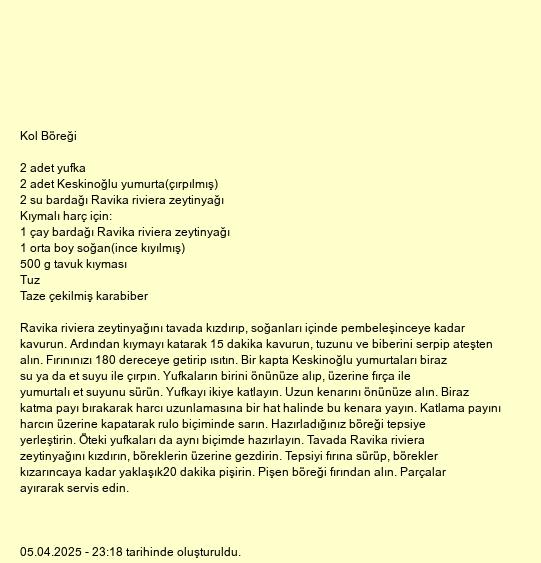 Ravika riviera zeytinyağını tavada kızdırıp, soğanları içinde pembeleşinceye kadar kavurun. Ardından kıymayı katarak 15 dakika kavurun, tuzunu ve biberini serpip ateşten alın. Fırınınızı 180 dereceye getirip ısıtın. Bir kapta Keskinoğlu yumurtaları biraz su ya da et suyu ile çırpın. Yufkaların birini önünüze alıp, üzerine fırça ile yumurtalı et suyunu sürün. Yufkayı ikiye katlayın. Uzun kenarını önünüze alın. Biraz katma payı bırakarak harcı uzunlamasına bir hat halinde bu kenara yayın. Katlama payını harcın üzerine kapatarak rulo biçiminde sarın. Hazırladığınız böreği tepsiye yerleştirin. Öteki yufkaları da aynı biçimde hazırlayın. Tavada Ravika riviera zeytinyağını kızdırın, böreklerin üzerine gezdirin. Tepsiyi fırına sürüp, börekler kızarıncaya kadar yaklaşık20 dakika pişirin. Pişen böreği fırından alın. Parçalar ayırarak servis edin.