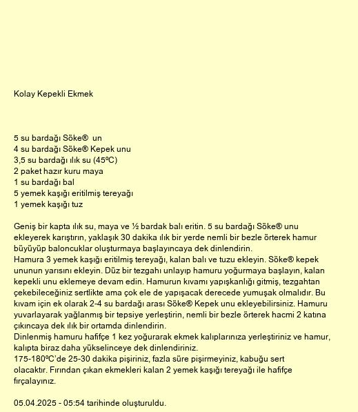 Hamura 3 yemek kaşığı eritilmiş tereyağı, kalan balı ve tuzu ekleyin. Söke® kepek ununun yarısını ekleyin. Düz bir tezgahı unlayıp hamuru yoğurmaya başlayın, kalan kepekli unu eklemeye devam edin. Hamurun kıvamı yapışkanlığı gitmiş, tezgahtan çekebileceğiniz sertlikte ama çok ele de yapışacak derecede yumuşak olmalıdır. Bu kıvam için ek olarak 2-4 su bardağı arası Söke® Kepek unu ekleyebilirsiniz. Hamuru yuvarlayarak yağlanmış bir tepsiye yerleştirin, nemli bir bezle örterek hacmi 2 katına çıkıncaya dek ılık bir ortamda dinlendirin.