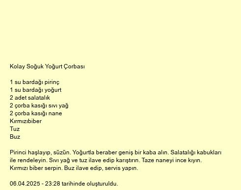 Pirinci haşlayıp, süzün. Yoğurtla beraber geniş bir kaba alın. Salatalığı kabukları ile rendeleyin. Sıvı yağ ve tuz ilave edip karıştırın. Taze naneyi ince kıyın. Kırmızı biber serpin. Buz ilave edip, servis yapın.