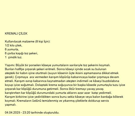 Karışım birbirine iyice yedirildikten sonra bunu sekiz kâseye veya balon bardağa bölerek koymalı. Kremaların üstünü temizlenmiş ve yıkanmış çileklerle doldurup servis yapmalı.