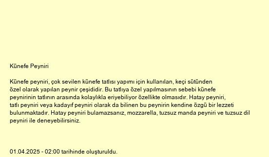 Künefe peyniri, çok sevilen künefe tatlısı yapımı için kullanılan, keçi sütünden özel olarak yapılan peynir çeşididir. Bu tatlıya özel yapılmasının sebebi künefe peynirinin tatlının arasında kolaylıkla eriyebiliyor özellikte olmasıdır. Hatay peyniri, tatlı peyniri veya kadayıf peyniri olarak da bilinen bu peynirin kendine özgü bir lezzeti bulunmaktadır. Hatay peyniri bulamazsanız, mozzarella, tuzsuz manda peyniri ve tuzsuz dil peyniri ile deneyebilirsiniz.