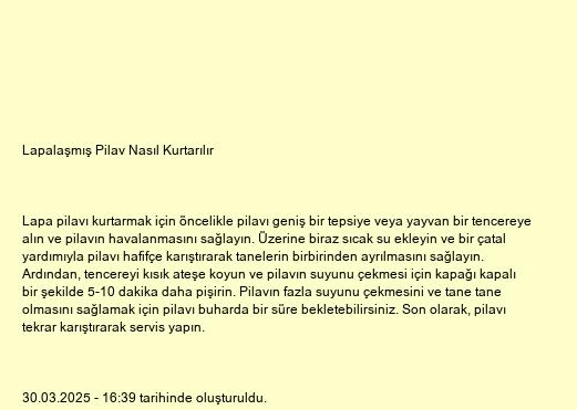 Lapa pilavı kurtarmak için öncelikle pilavı geniş bir tepsiye veya yayvan bir tencereye alın ve pilavın havalanmasını sağlayın. Üzerine biraz sıcak su ekleyin ve bir çatal yardımıyla pilavı hafifçe karıştırarak tanelerin birbirinden ayrılmasını sağlayın. Ardından, tencereyi kısık ateşe koyun ve pilavın suyunu çekmesi için kapağı kapalı bir şekilde 5-10 dakika daha pişirin. Pilavın fazla suyunu çekmesini ve tane tane olmasını sağlamak için pilavı buharda bir süre bekletebilirsiniz. Son olarak, pilavı tekrar karıştırarak servis yapın.