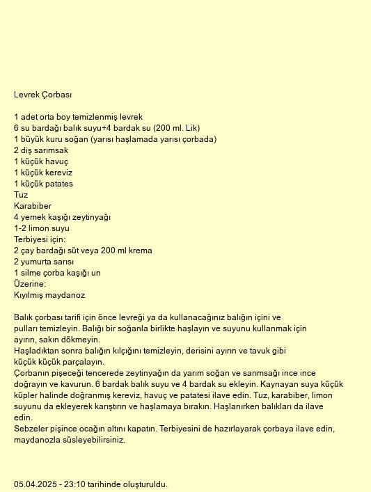Balık çorbası tarifi için önce levreği ya da kullanacağınız balığın içini ve pulları temizleyin. Balığı bir soğanla birlikte haşlayın ve suyunu kullanmak için ayırın, sakın dökmeyin.