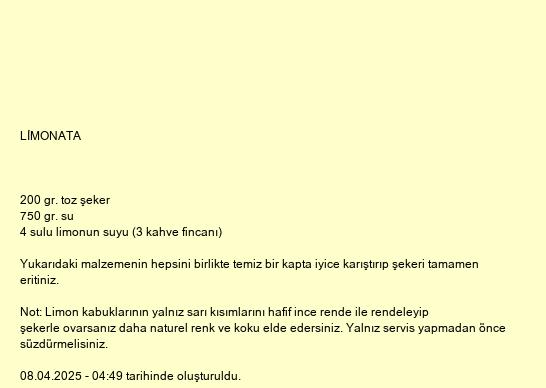 Not: Limon kabuklarının yalnız sarı kısımlarını hafif ince rende ile rendeleyip şekerle ovarsanız daha naturel renk ve koku elde edersiniz. Yalnız servis yapmadan önce süzdürmelisiniz.