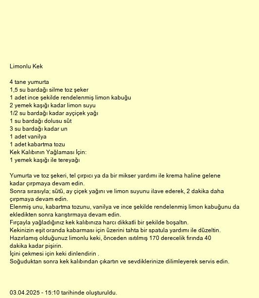 Hazırlamış olduğunuz limonlu keki, önceden ısıtılmış 170 derecelik fırında 40 dakika kadar pişirin.