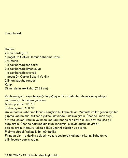Un ve hamur kabartma tozunu karıştırıp bir kaba eleyin. Yumurta ve toz şekeri ayrı bir çırpma kabına alın. Mikserin yüksek devrinde 3 dakika çırpın. Üzerine limon suyu, sıvı yağ, şekerli vanilin ve limon kabuğu rendesini ekleyip düşük devirde kısa bir süre çırpın. Üzerine hazırladığınız un karışımını ekleyip düşük devirde 1 dakika çırpın. Hamuru kalıba döküp üzerini düzeltin ve pişirin.
