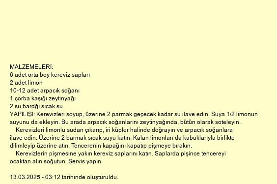 YAPILIŞI: Kerevizleri soyup, üzerine 2 parmak geçecek kadar su ilave edin. Suya 1/2 limonun suyunu da ekleyin. Bu arada arpacık soğanlarını zeytinyağında, bütün olarak soteleyin.