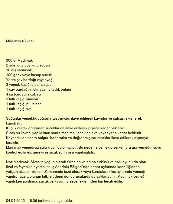 Not: Madımak, Sivas’ta yoğun olarak tüketilen ve adına türküsü ve halk oyunu da olan özel ve faydalı bir yemektir. İç Anadolu Bölgesi’nde bahar aylarında kendiliğinden yetişen otsu bir bitkidir. Zamanında taze olarak veya kurutularak kış aylarında yemeği yapılır. Taze toplanan bitkiler, derin dondurucularda da saklanabilir. Madımak yemeği yapılırken pastırma, sucuk ve kavurma seçeneklerinden biri tercih edilir.