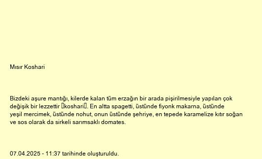 Bizdeki aşure mantığı, kilerde kalan tüm erzağın bir arada pişirilmesiyle yapılan çok değişik bir lezzettir koshari. En altta spagetti, üstünde fiyonk makarna, üstünde yeşil mercimek, üstünde nohut, onun üstünde şehriye, en tepede karamelize kıtır soğan ve sos olarak da sirkeli sarımsaklı domates.