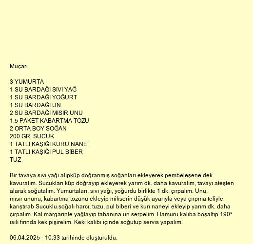 Bir tavaya sıvı yağı alıpküp doğranmış soğanları ekleyerek pembeleşene dek kavuralım. Sucukları küp doğrayıp ekleyerek yarım dk. daha kavuralım, tavayı ateşten alarak soğutalım. Yumurtaları, sıvı yağı, yoğurdu birlikte 1 dk. çırpalım. Unu, mısır ununu, kabartma tozunu ekleyip mikserin düşük ayarıyla veya çırpma teliyle karıştırab Sucuklu.soğalı harcı, tuzu, pul biberi ve kurı naneyi ekleyip yarım dk. daha çırpalım. Kal margarinle yağlayıp tabanına un serpelim. Hamuru kalıba boşaltıp 190° ısılı fırında kek pişirelim. Keki kalıbı içinde soğutup servis yapalım.