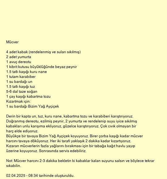 Not: Mücver harcını 2-3 dakika bekletin ki kabaklar kalan suyunu salsın ve böylece tekrar sıkabilin.