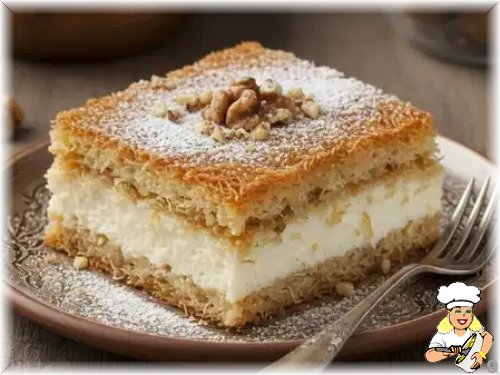Kadayıfı küçük parçalar halinde didikleyin. Tereyağını tavada eritip kadayıfları ekleyin ve kısık ateşte altın rengi alana kadar kavurun. İsteğe bağlı olarak ceviz ekleyin. Muhallebi için süt, şeker ve unu tencereye alıp sürekli karıştırarak koyulaşana kadar pişirin. Ocaktan almadan önce vanilin ve tereyağını ekleyip karıştırın. Servis kabına kavrulmuş kadayıfın yarısını yayın, üzerine sıcak muhallebiyi dökün. Kalan kadayıfı üstüne serpip oda sıcaklığında soğumaya bırakın. Buzdolabında en az 2 saat dinlendirdikten sonra dilimleyerek servis edin.