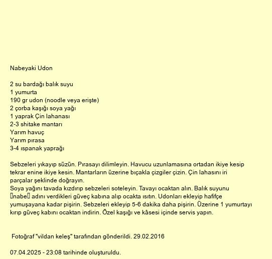 Soya yağını tavada kızdırıp sebzeleri soteleyin. Tavayı ocaktan alın. Balık suyunu nabe adını verdikleri güveç kabına alıp ocakta ısıtın. Udonları ekleyip hafifçe yumuşayana kadar pişirin. Sebzeleri ekleyip 5-6 dakika daha pişirin. Üzerine 1 yumurtayı kırıp güveç kabını ocaktan indirin. Özel kaşığı ve kâsesi içinde servis yapın.