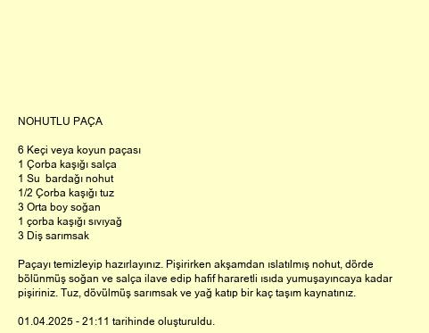 Paçayı temizleyip hazırlayınız. Pişirirken akşamdan ıslatılmış nohut, dörde bölünmüş soğan ve salça ilave edip hafif hararetli ısıda yumuşayıncaya kadar pişiriniz. Tuz, dövülmüş sarımsak ve yağ katıp bir kaç taşım kaynatınız.
