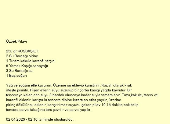 Yağ ve soğanı etle kavurun. Üzerine su ekleyıp karıştırılır. Kapalı olarak kısık ateşte pişirilir. Pişen etlerin suyu süzülüp bir çorba kaşığı yağda kavrulur. Bir tencereye kalan etin suyu 3 bardak oluncaya kadar suyla tamamlanır. Tuzu,kakule, tarçın ve karanfil eklenir, karıştırılır.tencere dibine kızartılan etler yayılır, üzerine pirinç dökülür.su eklenir, karıştırılmaz.suyunu çeken pilav 10,15 dakika bekletilip tencere servis tabağına ters çevrilir ve servis yapılır.