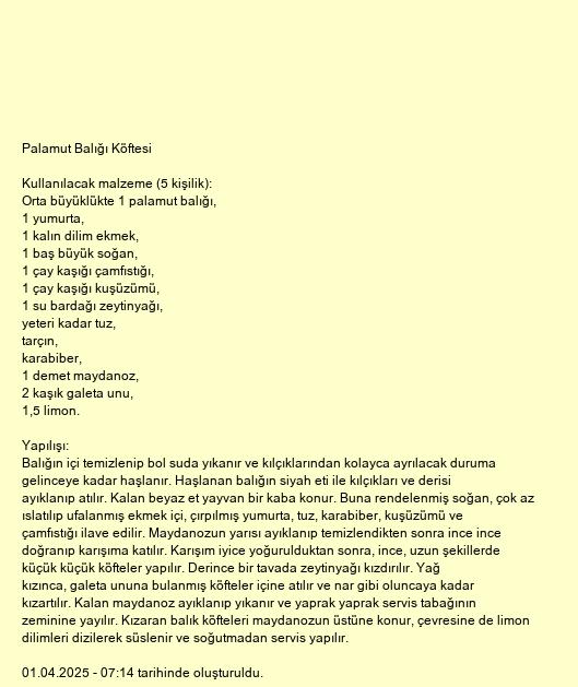 Balığın içi temizlenip bol suda yıkanır ve kılçıklarından kolayca ayrılacak duruma gelinceye kadar haşlanır. Haşlanan balığın siyah eti ile kılçıkları ve derisi ayıklanıp atılır. Kalan beyaz et yayvan bir kaba konur. Buna rendelenmiş soğan, çok az ıslatılıp ufalanmış ekmek içi, çırpılmış yumurta, tuz, karabiber, kuşüzümü ve çamfıstığı ilave edilir. Maydanozun yarısı ayıklanıp temizlendikten sonra ince ince doğranıp karışıma katılır. Karışım iyice yoğurulduktan sonra, ince, uzun şekillerde küçük küçük köfteler yapılır. Derince bir tavada zeytinyağı kızdırılır. Yağ kızınca, galeta ununa bulanmış köfteler içine atılır ve nar gibi oluncaya kadar kızartılır. Kalan maydanoz ayıklanıp yıkanır ve yaprak yaprak servis tabağının zeminine yayılır. Kızaran balık köfteleri maydanozun üstüne konur, çevresine de limon dilimleri dizilerek süslenir ve soğutmadan servis yapılır.
