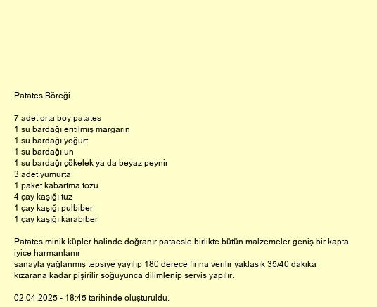 Patates minik küpler halinde doğranır pataesle birlikte bütün malzemeler geniş bir kapta iyice harmanlanır