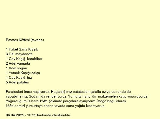 Patatesleri önce haşlıyoruz. Haşladığımız patatesleri çatalla eziyoruz,rende de yapabilirsiniz. Soğanı da rendeliyoruz. Yumurta hariç tüm malzemeleri katıp yoğuruyoruz. Yoğurduğumuz harcı köfte şeklinde parçalara ayırıyoruz. İsteğe bağlı olarak köftelerimizi yumurtaya batırıp tavada sana yağda kızartıyoruz.