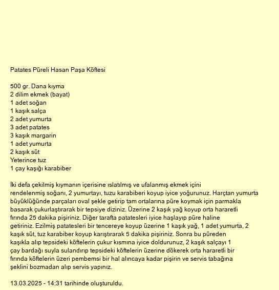 İki defa çekilmiş kıymanın içerisine ıslatılmış ve ufalanmış ekmek içini rendelenmiş soğanı, 2 yumurtayı, tuzu karabiberi koyup iyice yoğurunuz. Harçtan yumurta büyüklüğünde parçaları oval şekle getirip tam ortalarına püre koymak için parmakla basarak çukurlaştırarak bir tepsiye diziniz. Üzerine 2 kaşık yağ koyup orta hararetli fırında 25 dakika pişiriniz. Diğer tarafta patatesleri iyice haşlayıp püre haline getiriniz. Ezilmiş patatesleri bir tencereye koyup üzerine 1 kaşık yağ, 1 adet yumurta, 2 kaşık süt, tuz karabiber koyup karıştırarak 5 dakika pişiriniz. Sonra bu püreden kaşıkla alıp tepsideki köftelerin çukur kısmına iyice doldurunuz, 2 kaşık salçayı 1 çay bardağı suyla sulandırıp tepsideki köftelerin üzerine dökerek orta hararetli bir fırında köftelerin üzeri pembemsi bir hal alıncaya kadar pişirin ve servis tabağına şeklini bozmadan alıp servis yapınız.